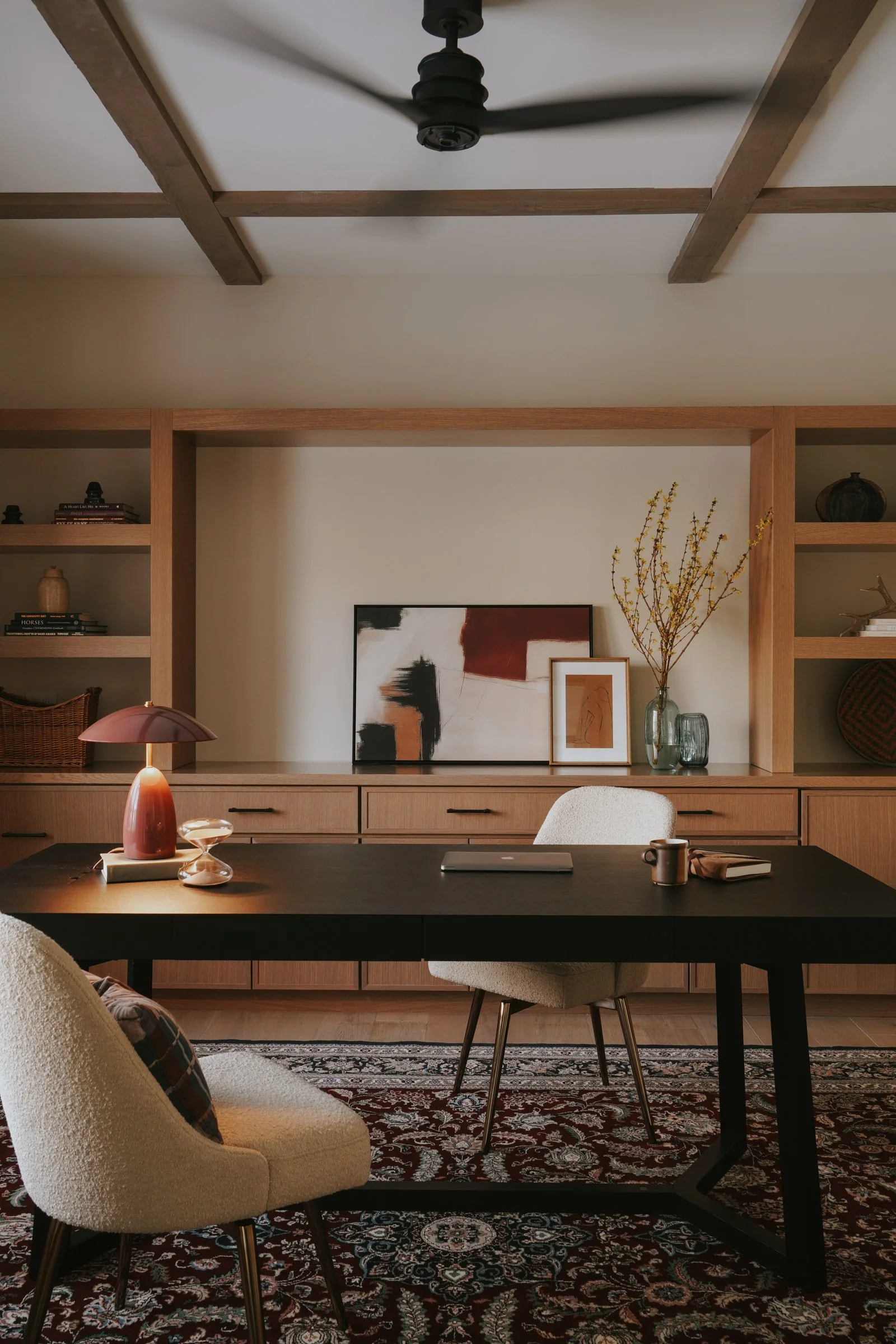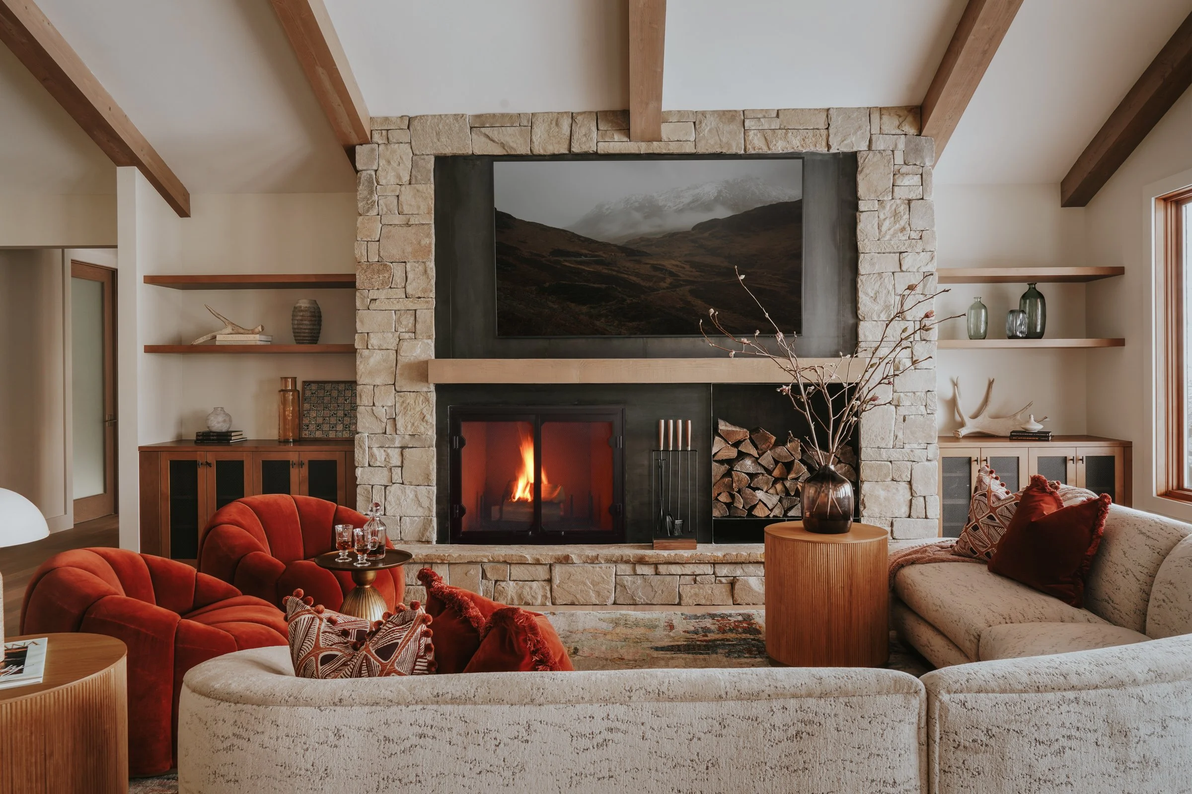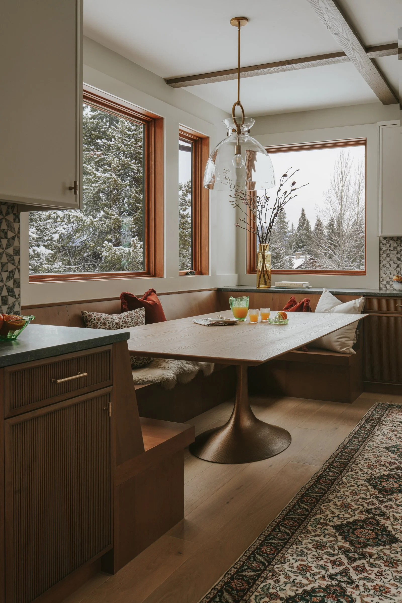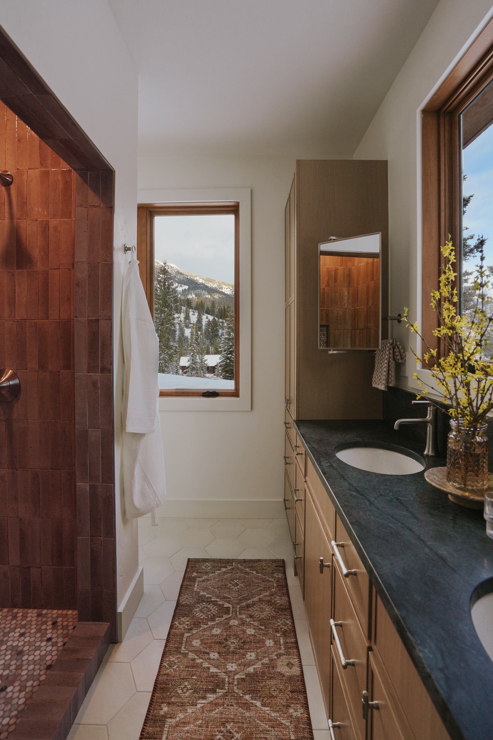 Situated in the mountains of Big Sky, Montana, this 1998 home received a full remodel plus new addition to double its original footprint. The homeowners, now retired, enjoy traveling together much of the year; from Vietnam to Bhutan and Borneo. They wanted their space to reflect aspects of South/Southeast Asian style and ‘Japandi’ [Japanese/Scandinavian] Minimalism, while still honoring a Mountain-West vernacular.